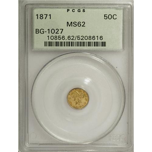 <B>1871 50C Liberty Round 50 Cents, BG-1027, R.3, MS62 PCGS.</B></I> PCGS Population (39/10). NGC Census: (10/6). (#10856)<BR><BR><b>Shipping:</b> Coins & Currency (<a target="_blank" href="http://www.heritageauctions.com/common/shipping.php">view shipping information</a>)