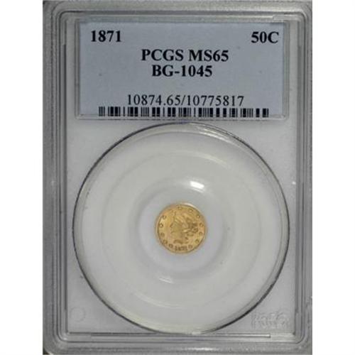 <B>1871 50C Liberty Round 50 Cents, BG-1045, R.5, MS65 PCGS.</B></I> This semi-prooflike Gem has an exquisite strike and an undisturbed appearance. The obverse field has light orange toning, while the rest of this delightful piece is green-gold. Population: 2 in 65, 1 finer (12/07).<BR><BR><b>Shipping:</b> Coins & Currency (<a target="_blank" href="http://www.heritageauctions.com/common/shipping.php">view shipping information</a>)