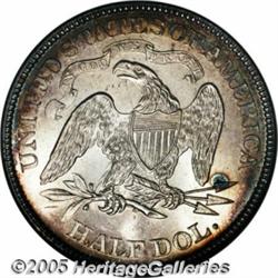 <B>1871 50C MS65 NGC.</B></I> Silver-gray luster overlays each side this well struck and satiny Gem. This color deepens to deep russet and cobalt-blue at the peripheries. The reverse is splendidly undisturbed, save for a toning spot near the eagle's right wingtip and a tiny milling mark near his beak. The obverse field has only a couple of faint luster grazes. Population: 7 in 65, 3 finer (2/05).