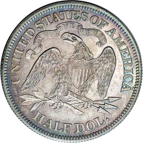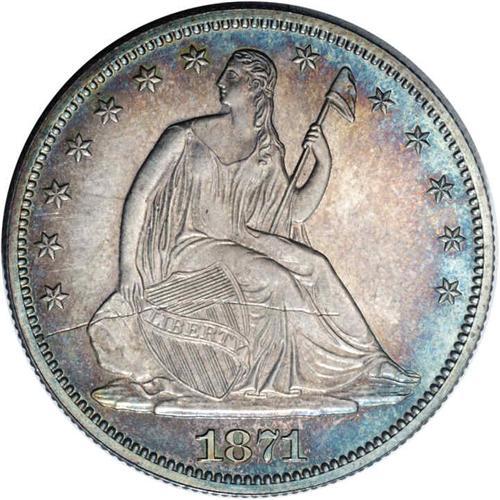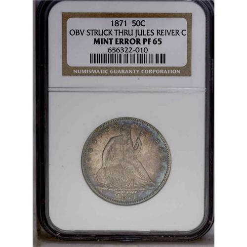 <B>1871<50C>--Obverse Struck Thru--PR65 NGC.</B></I> Dusky peach toning consumes much of this meticulously struck Gem, but mauve, electric-blue, and apple-green colors adorn the rims. Apparently struck through a thin, lengthy, and horizontally placed wire, which came between the planchet and the obverse die from 8 o'clock to Liberty's right (facing) leg. Such a strike-thru is very unusual for a 19th century proof. 960 proofs were struck, only a portion of which have survived unimpaired. Population: 12 in 65, 7 finer (9/05).