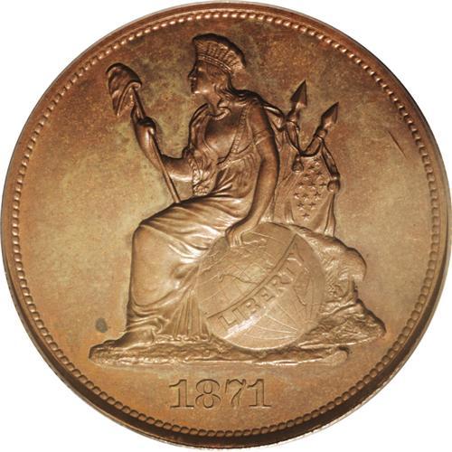 <B>1871<50C> Longacre Indian Princess Half Dollar, Judd-1106, Pollock-1242, Low R.7, PR64 Brown PCGS.</B></I> A seated representation of Liberty faces left on the obverse, wearing an Indian headdress and supporting a liberty pole with her right hand. Her left hand rests on a globe with a ribbon inscribed LIBERTY. The date 1871 is below. On the reverse, the denomination 50 CENTS is situated within a wreath of cotton and corn with STANDARD above. Struck in copper with a reeded edge. This is the only Judd-1106 example that we have handled, and it is an attractively toned near-Gem. Medium reddish-brown patina is accented with a smattering of mint red color remaining in the protected areas. Powerfully impressed with no readily evident hairlines, one black spot is mentioned at Liberty's foot as a pedigree identifier.