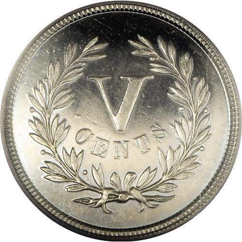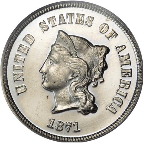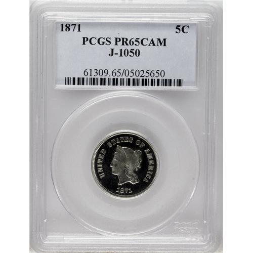 <B>1871 5C Five Cents, Judd-1050, Pollock-1184, Low R.6, PR65 Cameo PCGS.</B></I> The obverse bears a portrait of Liberty similar to that used on the nickel three cent piece. The date is below and UNITED STATES OF AMERICA is above the central device. The reverse depicts a reversed Roman numeral five and the word CENTS is within a wreath. Struck in nickel with a plain edge. Nicely mirrored with a few insignificant carbon flecks on the obverse. A V-shaped lint mark is noted near Liberty's chin.<BR><BR><b>Shipping:</b> Coins & Currency (<a target="_blank" href="http://www.heritageauctions.com/common/shipping.php">view shipping information</a>)