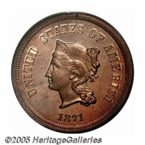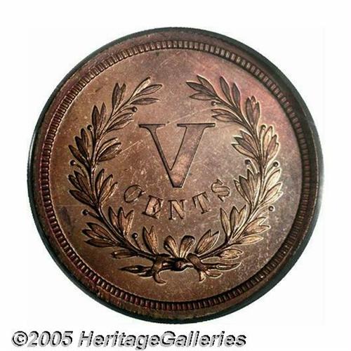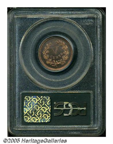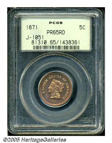 <B>1871<5C> Five Cents, Judd-1051, Pollock-1185, R.5, PR65 Red PCGS.</B></I> This practical design uses the three cent nickel obverse design in a larger format. The reverse has V CENTS in the center with the V reversed, surrounded by a wreath. Struck in copper with a plain edge. This piece, like every J-1051 seen by this cataloger, has the 7 in the date apparently punched over a sidewise 1. Blazing red mint luster characterizes this piece and is further enhanced by bright orange-red centers that deepen to cherry-red at the margins. A rare opportunity to acquire a full red copper pattern from the 1870s.<BR><I>From The Western Hills Collection.</B></I>