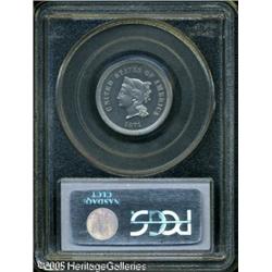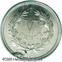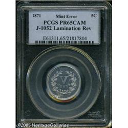 <B>1871 5C Five Cents, Judd-1052, Pollock-1186, R.7, PR65 Cameo, Lamination on Reverse, PCGS.</B></I> The obverse repeats a familiar pattern with the devices closely resembling that on the adopted Three Cent Nickel, and the reverse has a backward V in the center with CENTS below, surrounded by a laurel wreath. Struck on a regular sized planchet and struck in aluminum with a plain edge. An interesting planchet lamination has occurred on the lower reverse at 7 o'clock, this being highly unusual for <I>any</B></I> pattern issue. Still, this is a spectacular aluminum pattern that is as bright as the day it was minted with no signs of oxidation on either side. A rare opportunity for the pattern specialist. Lot:9858