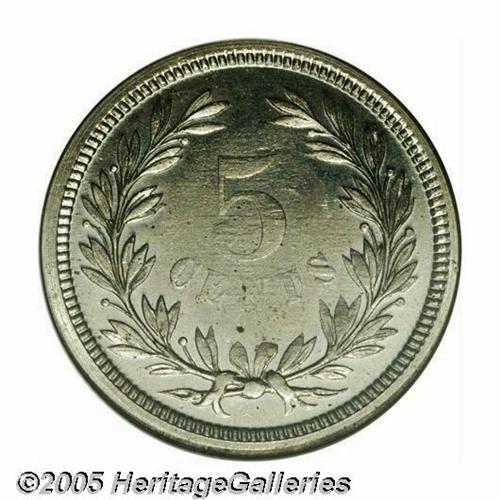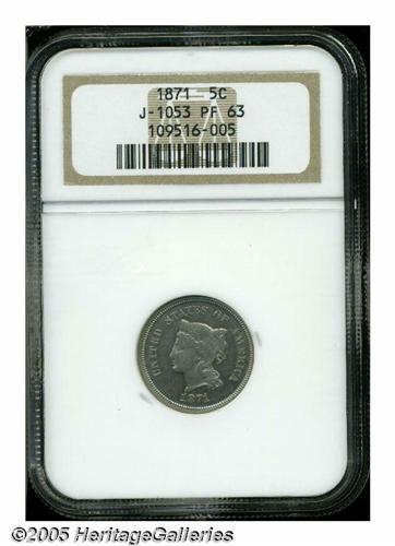 <B>1871<5C> Five Cents, Judd-1053, Pollock-1188, High R.6, PR63 NGC.</B></I> Liberty head obverse, facing left, wearing a coronet. Simple laurel wreath and denomination reverse. Struck in nickel with a plain edge. A bit softly struck, seemingly a normal trait of this pattern issue, with a few scattered carbon flecks on each side.<BR><I>From The Western Hills Collection.</B></I>