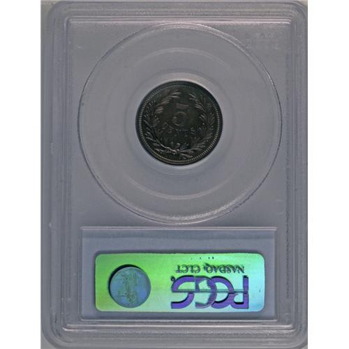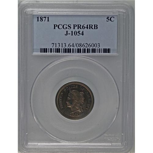 <B>1871<5C> Five Cents, Judd-1054, Pollock-1189, R.6, PR64 Red and Brown PCGS.</B></I> The obverse is similar to the adopted three cent nickel design, while the reverse has 5 CENTS in the center and is surrounded by a laurel wreath. Struck in copper with a plain edge. Both sides are subdued by a thin veil of patina that culminates in iridescent accents. Population: 4 in 64, 0 finer (7/06).