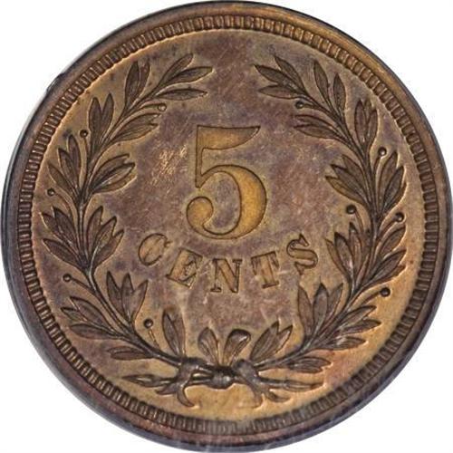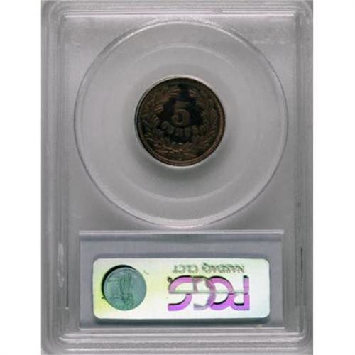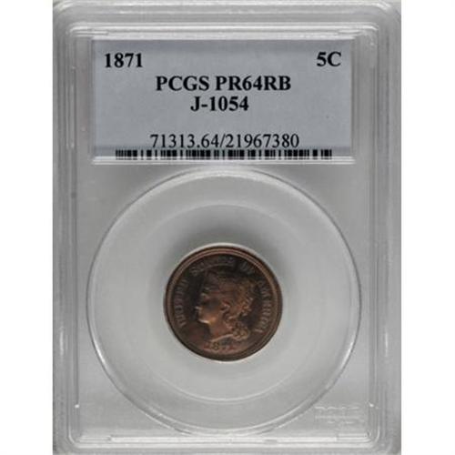 <B>1871 5C Five Cents, Judd-1054, Pollock-1189, R.6, PR64 Red and Brown PCGS.</B></I> The obverse is similar to the adopted three cent nickel design, while the reverse has 5 CENTS in the center and is surrounded by a laurel wreath. Struck in copper with a plain edge. A relatively common pattern, this piece retains nearly full mint red color with just a hint of mellowing on each side. The fields are deeply reflective and the surfaces are generally problem-free.<BR><BR><b>Shipping:</b> Coins & Currency (<a target="_blank" href="http://www.heritageauctions.com/common/shipping.php">view shipping information</a>)