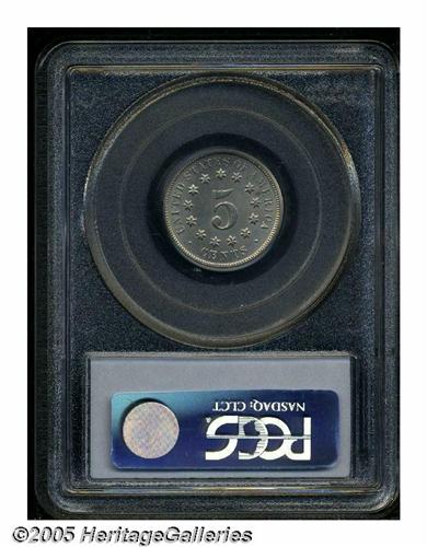 <B>1871<5C> MS64 PCGS.</B></I> The low mintage 1871 (561,000 pieces) is among the scarcer Shield nickel issues in Mint State. This piece has light tan lustrous surfaces, and reveals some minor grade-defining marks on the shield. The strike on the obverse design elements is weak in spots, particularly on the leaves and the peripheral parts of the shield. Population: 20 in 64, 26 finer (3/05).