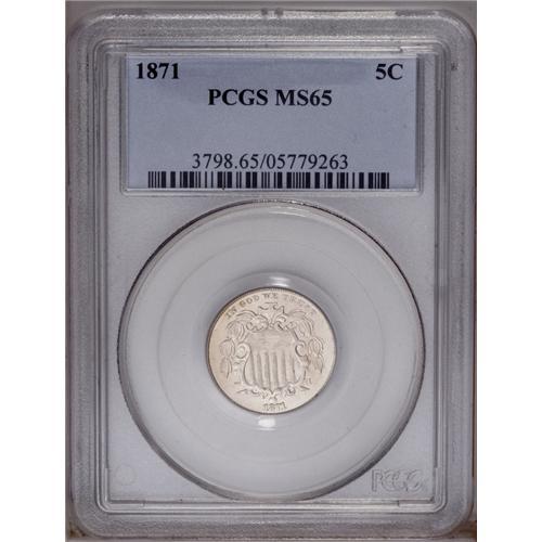 <B>1871<5C> MS65 PCGS.</B></I> Light golden toning visits the left margins of this lustrous, unblemished, and nicely struck Gem. The 1871 is scarcer in quality Mint State than as a proof. Population: 24 in 65, 5 finer (1/06).