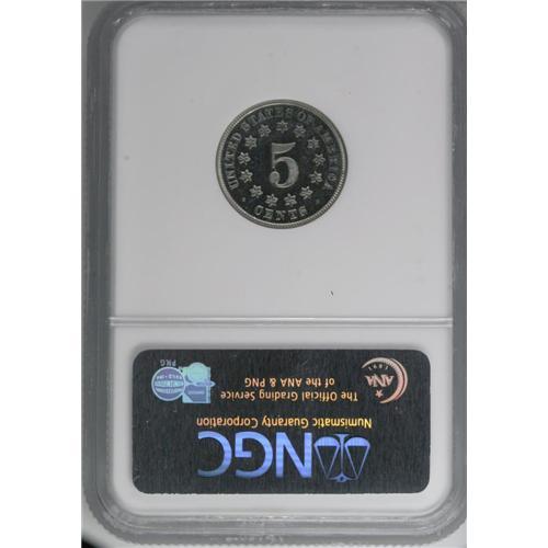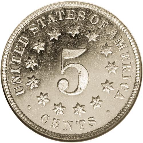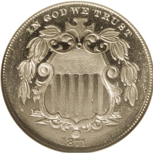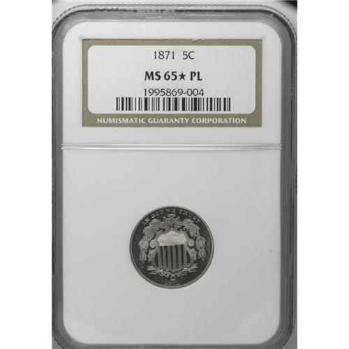 <B>1871<5C> MS65 <img border='0' src='http://www.heritagecoins.com/images/star.gif' width=10 height=10> Prooflike NGC.</B></I> A better date in the Shield nickel series, the 1871 was issued to the extent of only 561,000 pieces. The silver-blue surfaces have excellent field-device contrast, with excellent field reflectivity and frosty devices, and there is no trace of toning. Tiny contact marks, tiny dark toning flecks, and a mentionable luster break in the right obverse field account for the grade, but much eye appeal is present.