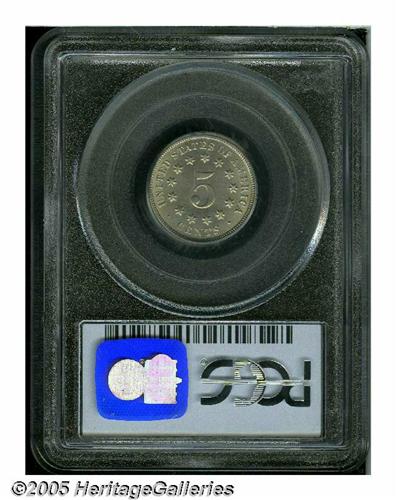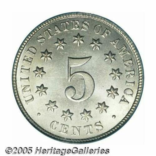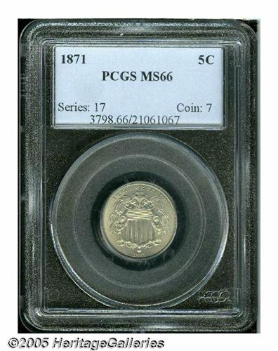 <B>1871<5C> MS66 PCGS.</B></I> Satiny with impeccably smooth fields and well struck features that are only lacking on the highpoints of the lower left portion of the shield. Delicate golden-orange peripheral accents are more noticeable on the reverse. The 1871 is scarce at any level of Mint State and is especially elusive in Gem and better condition. Population: 4 in 66, 0 finer (4/05).<BR><I>From The Western Hills Collection.</B></I>