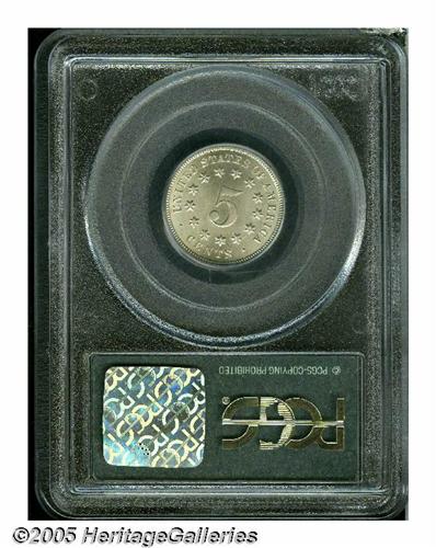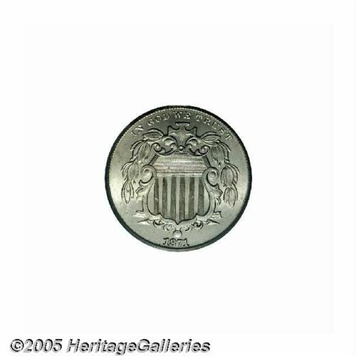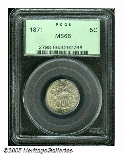 <B>1871<5C> MS66 PCGS.</B></I> The semi-key 1871 has a mintage of slightly more than half a million pieces and is elusive in all grades. While a handful of pieces exist in the lower Mint State grades, this issue is all but nonexistent above MS65. This example has sparkling mint brilliance and is fully struck throughout. Problem-free and quite rare in this superior grade. Population: 4 in 66, none are finer at either service (6/05).