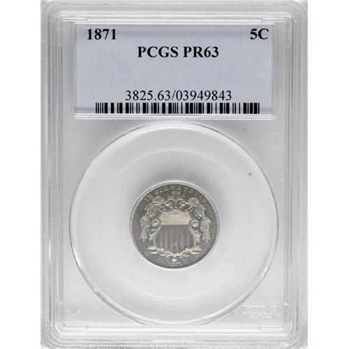 <B>1871 5C PR63 PCGS.</B></I> PCGS Population (39/251). NGC Census: (58/386). Mintage: 960. Numismedia Wsl. Price for NGC/PCGS coin in PR63: $308. (#3825)<BR><BR><b>Shipping:</b> Coins & Currency (<a target="_blank" href="http://www.heritageauctions.com/common/shipping.php">view shipping information</a>)