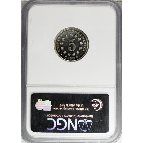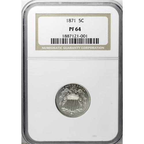 <B>1871 5C PR64 NGC.</B></I> A moderately reflective nickel-gray near-Gem that has small spots of haze on each side. A touch of reddish-gold is visible on the shield, and light hairlines are present on the reverse.<BR><I>From The Cocoa Beach Collection.</B></I><BR><BR><b>Shipping:</b> Coin/Currency (<a target="_blank" href="http://www.heritageauctions.com/common/shipping.php">view shipping information</a>)