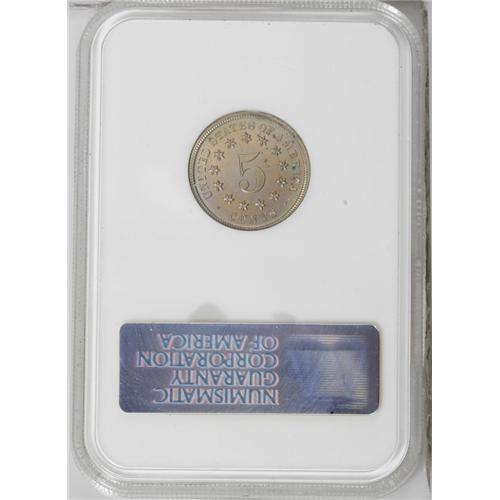 <B>1871<5C> PR64 NGC.</B></I> Pastel pink, gold, and lime shades illuminate this satiny and intricately struck example. The upper right reverse has a few toning flecks. A low mintage date. Housed in an older generation holder.