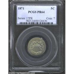<TABLE cellSpacing=0 cellPadding=0 width="100%" bgColor=#000000 border=0><TBODY><TR><TD width="100%"><TABLE cellSpacing=1 cellPadding=3 width="100%" border=0><TBODY><TR><TD width="100%" bgColor=#79735c><FONT face=arial color=#ffffff size=3><B>Description</B> </FONT></TD></TR><TR><TD width="100%" bgColor=#ffffff><FONT face=arial size=2><B>1871 5C PR64 PCGS.</B></I> Lovely variegated gold and gray colors alternate on each side, producing an attractive two-toned appearance. There a few tiny nicks near the reverse center, and a partial fingerprint fragment (as struck) resides near the left obverse rim. Population: 124 in 64, 113 finer (4/03). </FONT></TD></TR></TBODY></TABLE></TD></TR></TBODY></TABLE><BR><A name=PricesRealized></A><TABLE cellSpacing=0 cellPadding=0 width="100%" bgColor=#000000 border=0><TBODY><TR><TD width="100%"><TABLE cellSpacing=1 cellPadding=3 width="100%" border=0><TBODY><TR><TD width="100%" bgColor=#79735c><A name=PR><FONT face=arial color=#ffffff size=3><B>Previous Prices from Heritage Auctions</B> </FONT></A></TD></TR><TR><TD bgColor=#f6f6ed><TABLE cellSpacing=0 cellPadding=0 width="100%" border=1><TBODY><TR><TD align=middle width="33%"><B>Date</B></TD><TD align=middle width="33%"><B>Service</B></TD><TD align=middle width="33%"><B>Price</B></TD></TR><TR bgColor=whitesmoke><TD width="33%"><B>11/15/2001</B></TD><TD width="33%">PCGS</TD><TD width="33%">$414.00</TD></TR><TR bgColor=whitesmoke><TD width="33%"><B>01/06/1996</B></TD><TD width="33%">PCGS</TD><TD width="33%">$341.00</TD></TR><TR bgColor=whitesmoke><TD width="33%"><B>11/18/2000</B></TD><TD width="33%">NGC</TD><TD width="33%">$322.00</TD></TR></TBODY></TABLE></TD></TR><TR><TD bgColor=#ffffff><FONT face=arial size=1 ?>PLEASE NOTE: All prices realized reflect the final hammer price PLUS the buyer's premium in auctions that charge a buyer's premium. Each item has a notation at the top of the listing indicating whether that lot included a buyer's premium. Example: A item that sells with a final hammer price of $100 and a 20% buyer's premium will display with a price realized of $120. All information listed is intended to be as accurate as possible, but errors are possible. Please use this guide carefully and inform us of any inaccuracies. </FONT></TD></TR></TBODY></TABLE></TD></TR></TBODY></TABLE><BR><TABLE cellSpacing=0 cellPadding=0 width="100%" bgColor=#000000 border=0><TBODY><TR><TD width="100%"><TABLE cellSpacing=1 cellPadding=3 width="100%" border=0><TBODY><TR><TD width="100%" bgColor=#79735c colSpan=6><FONT face=arial color=#ffffff size=3><B>Price Guide*</B> </FONT></TD></TR><TR bgColor=#f6f6ed><TD align=middle><B>Grade</B> </TD><TD align=middle><B>Coin World<BR>(Trends)</B> </TD><TD align=middle><B>Numismedia<BR>Retail</B> </TD><TD align=middle><B>Numismedia<BR>Wholesale</B> </TD><TD align=middle><B>Coin<BR>Universe</B> </TD><TD align=middle><B>Heritage<BR>Value Index</B> </TD></TR><TR bgColor=#ffffff><TD align=middle>63</TD><TD align=right>---</TD><TD align=right>$370.00</TD><TD align=right>$308.00</TD><TD align=right>$275.00</TD><TD align=right>$195.25</TD></TR><TR style="FONT-WEIGHT: bold" bgColor=#cccfdd><TD align=middle>64</TD><TD align=right>---</TD><TD align=right>$500.00</TD><TD align=right>$400.00</TD><TD align=right>$365.00</TD><TD align=right>$303.50</TD></TR><TR bgColor=#ffffff><TD align=middle>65</TD><TD align=right>---</TD><TD align=right>---</TD><TD align=right>$800.00</TD><TD align=right>$1,235.00</TD><TD align=right>$802.33</TD></TR><TR bgColor=#ffffff><TD colSpan=6><FONT size=1>*All information listed is intended to be as accurate as possible, but errors are possible. No item may be returned or refused based on this information which is provided as a service to our customers. You should contact each pricing source directly to determine the accuracy of this information. </FONT></TD></TR></TBODY></TABLE></TD></TR></TBODY></TABLE><BR><TABLE cellSpacing=0 cellPadding=0 width="100%" bgColor=#000000 border=0><TBODY><TR><TD width="100%"><TABLE cellSpacing=1 cellPadding=3 width="100%" border=0><TBODY><TR><TD width="100%" bgColor=#79735c><FONT face=arial color=#ffffff size=3><B>Population Guide</B> </FONT></TD></TR><TR bgColor=#ffffff><TD align=middle><!-- Begin Output of Population Grid--><TABLE cellSpacing=0 cellPadding=0 width="100%" border=0><TBODY><TR><TD vAlign=center><TABLE cellSpacing=0 width="100%" border=1 cellsadding="3"><TBODY><TR><TD vAlign=center><TABLE cellSpacing=0 cellPadding=3 width="100%" border=1><TBODY><TR><TD vAlign=center align=middle bgColor=#f0f1e8 colSpan=2 <CENTER><FONT face=Arial size=2><B>PCGS Pop </B></FONT><CENTER></CENTER></TD><TD vAlign=center align=middle bgColor=#f0f1e8 colSpan=2><CENTER><FONT face=Arial size=2><B>NGC Pop</B></CENTER></FONT></TD></TR><TR><TD vAlign=center><FONT face=Arial size=2>(64)</FONT> </TD><TD vAlign=center align=right><FONT face=Arial size=2>124</FONT> </TD><TD vAlign=center><FONT face=Arial size=2>(64)</FONT> </TD><TD vAlign=center align=right><FONT face=Arial size=2>74</FONT> </TD></TR><TR><TD vAlign=center><FONT face=Arial size=2>(>64)</FONT> </TD><TD vAlign=center align=right><FONT face=Arial size=2>113</FONT> </TD><TD vAlign=center><FONT face=Arial size=2>(>64)</FONT> </TD><TD vAlign=center align=right><FONT face=Arial size=2>91</FONT> </TD></TR></TBODY></TABLE></TD></TR></TBODY></TABLE></TD></TR></TBODY></TABLE><!-- End Output of Population Grid--> Important notice: Heritage usually auctions material at the rate of 200-250 lots per hour. On some occasions eBay Live bid software or the Internet may not be able to keep up with the pace of the auction. We recommend placing a realistic absentee bid now as insurance to avoid disappointment. Occasionally the auctioneer may eliminate or reject an eBay Live bid, and the auctioneer may also reopen a lot after the close of the eBay live bidding (usually because we missed an audience bid), and may reject your bid even if it shows you as the winning bidder. By bidding via eBay Live, you agree tha