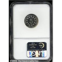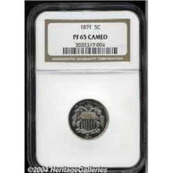 <B>1871<5C> PR65 Cameo NGC.</B></I> Nicely mirrored fields and mildly frosted devices create a pleasing cameo contrast. Several tiny, pepper-like spots are evenly distributed over both sides. This is one of 960 proofs minted for the year. <BR><BR><B>Important notice:</B> Heritage usually auctions material at the rate of 200-250 lots per hour. On some occasions eBay Live bid software or the Internet may not be able to keep up with the pace of the auction. We recommend placing a realistic absentee bid now as insurance to avoid disappointment. Occasionally the auctioneer may eliminate or reject an eBay Live bid, and the auctioneer may also reopen a lot after the close of the eBay live bidding (usually because we missed an audience bid), and may reject your bid even if it shows you as the winning bidder. By bidding via eBay Live, you agree that Heritage may award the lot to another bidder at its sole discretion under the circumstances described above or any other reasonable circumstances. Since eBay bids are not shown to us until we open the lot on the floor, we treat those bids just like floor bids. In most cases the floor responds before the eBay bid is presented to us, due to Internet lag time, so for consistency we have made it a policy that floor bids are always considered first over tie eBay live bids. Also please note that all Heritage lots purchased through eBay Live carry a 20% Buyer's Premium. Please make sure you read the Terms and Conditions before you bid.