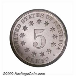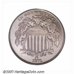 1871 5C PR65 Cameo PCGS. The Philadelphia Mint used at least three die pairs for the proof 1871 Shield Nickel delivery. This is an unusually high number for an issue with a total mintage of only 960 coins. The 1871 is among the more desirable issues in the proof Shield Nickel series because the similarly dated business strike is a low mintage date. Both sides of the present Gem are untoned--a feature that allows full appreciation of the glassy fields and frosty textured devices. There are also no bothersome contact marks or hairlines, and the strike is expectantly full in all areas. Population: 3 in 65 Cameo, only four are finer with this finish (9/02). Important notice: We expect to be auctioning lots at the rate of 200-250 per hour. Sometimes eBay Premier live bid software cannot keep up with that pace, so we strongly recommend that you place a realistic proxy bid now as insurance to avoid disappointment. Also please note that all Heritage/CAA lots purchased through eBay Premier carry a 20% Buyer's Premium. Please make sure you read the Terms and Conditions.