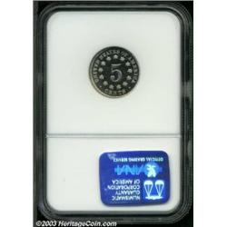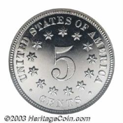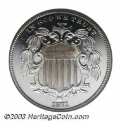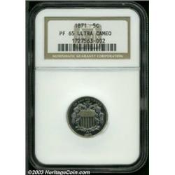 <TABLE cellSpacing=0 cellPadding=0 width="100%" bgColor=#000000 border=0><TBODY><TR><TD width="100%"><TABLE cellSpacing=1 cellPadding=3 width="100%" border=0><TBODY><TR><TD width="100%" bgColor=#79735c><FONT face=arial color=#ffffff size=3><B>Description</B> </FONT></TD></TR><TR><TD width="100%" bgColor=#ffffff><FONT face=arial size=2><B>1871 5C PR65 Ultra Cameo NGC.</B></I> The shield has apricot patina, while the remainder of the carefully preserved surfaces are fully brilliant. The cameo contrast is unimprovable, and the strike is razor-sharp. A pair of miniscule ticks on the prominent 5 are all that limit the grade. 1871 has a lower business strike production, which puts date pressure on the proofs. Population: 1 in 65, 1 finer (7/03). </FONT></TD></TR></TBODY></TABLE></TD></TR></TBODY></TABLE><BR><A name=PricesRealized></A><TABLE cellSpacing=0 cellPadding=0 width="100%" bgColor=#000000 border=0><TBODY><TR><TD width="100%"><TABLE cellSpacing=1 cellPadding=3 width="100%" border=0><TBODY><TR><TD width="100%" bgColor=#79735c><A name=PR><FONT face=arial color=#ffffff size=3><B>Previous Prices from Heritage Auctions</B> </FONT></A></TD></TR><TR><TD bgColor=#f6f6ed>No Prior Data Recorded </TD></TR><TR><TD bgColor=#ffffff><FONT face=arial size=1 ?>PLEASE NOTE: All prices realized reflect the final hammer price PLUS the buyer's premium in auctions that charge a buyer's premium. Each item has a notation at the top of the listing indicating whether that lot included a buyer's premium. Example: A item that sells with a final hammer price of $100 and a 20% buyer's premium will display with a price realized of $120. All information listed is intended to be as accurate as possible, but errors are possible. Please use this guide carefully and inform us of any inaccuracies. </FONT></TD></TR></TBODY></TABLE></TD></TR></TBODY></TABLE><BR><TABLE cellSpacing=0 cellPadding=0 width="100%" bgColor=#000000 border=0><TBODY><TR><TD width="100%"><TABLE cellSpacing=1 cellPadding=3 width="100%" border=0><TBODY><TR><TD width="100%" bgColor=#79735c colSpan=6><FONT face=arial color=#ffffff size=3><B>Price Guide*</B> </FONT></TD></TR><TR bgColor=#f6f6ed><TD align=middle><B>Grade</B> </TD><TD align=middle><B>Coin World<BR>(Trends)</B> </TD><TD align=middle><B>Numismedia<BR>Retail</B> </TD><TD align=middle><B>Numismedia<BR>Wholesale</B> </TD><TD align=middle><B>Coin<BR>Universe</B> </TD><TD align=middle><B>Heritage<BR>Value Index</B> </TD></TR><TR bgColor=#ffffff><TD align=middle>64</TD><TD align=right>---</TD><TD align=right>---</TD><TD align=right>---</TD><TD align=right>---</TD><TD align=right>$315.00</TD></TR><TR style="FONT-WEIGHT: bold" bgColor=#cccfdd><TD align=middle>65</TD><TD align=right>---</TD><TD align=right>---</TD><TD align=right>---</TD><TD align=right>---</TD><TD align=right>$742.50</TD></TR><TR bgColor=#ffffff><TD align=middle>66</TD><TD align=right>---</TD><TD align=right>---</TD><TD align=right>---</TD><TD align=right>---</TD><TD align=right>---</TD></TR><TR bgColor=#ffffff><TD colSpan=6><FONT size=1>*All information listed is intended to be as accurate as possible, but errors are possible. No item may be returned or refused based on this information which is provided as a service to our customers. You should contact each pricing source directly to determine the accuracy of this information. </FONT></TD></TR></TBODY></TABLE></TD></TR></TBODY></TABLE><BR><TABLE cellSpacing=0 cellPadding=0 width="100%" bgColor=#000000 border=0><TBODY><TR><TD width="100%"><TABLE cellSpacing=1 cellPadding=3 width="100%" border=0><TBODY><TR><TD width="100%" bgColor=#79735c><FONT face=arial color=#ffffff size=3><B>Population Guide</B> </FONT></TD></TR><TR bgColor=#ffffff><TD align=middle><!-- Begin Output of Population Grid--><TABLE cellSpacing=0 cellPadding=0 width="100%" border=0><TBODY><TR><TD vAlign=center><TABLE cellSpacing=0 width="100%" border=1 cellsadding="3"><TBODY><TR><TD vAlign=center><TABLE cellSpacing=0 cellPadding=3 width="100%" border=1><TBODY><TR><TD vAlign=center align=middle bgColor=#f0f1e8 colSpan=2 <CENTER><FONT face=Arial size=2><B>PCGS Pop </B></FONT><CENTER></CENTER></TD><TD vAlign=center align=middle bgColor=#f0f1e8 colSpan=2><CENTER><FONT face=Arial size=2><B>NGC Pop</B></CENTER></FONT></TD></TR><TR><TD vAlign=center><FONT face=Arial size=2>(65)</FONT> </TD><TD vAlign=center align=right><FONT face=Arial size=2>0</FONT> </TD><TD vAlign=center><FONT face=Arial size=2>(65)</FONT> </TD><TD vAlign=center align=right><FONT face=Arial size=2>0</FONT> </TD></TR><TR><TD vAlign=center><FONT face=Arial size=2>(>65)</FONT> </TD><TD vAlign=center align=right><FONT face=Arial size=2>0</FONT> </TD><TD vAlign=center><FONT face=Arial size=2>(>65)</FONT> </TD><TD vAlign=center align=right><FONT face=Arial size=2>0</FONT> </TD></TR></TBODY></TABLE></TD></TR></TBODY></TABLE></TD></TR></TBODY></TABLE><!-- End Output of Population Grid--> Important notice: Heritage usually auctions material at the rate of 200-250 lots per hour. On some occasions eBay Live bid software or the Internet may not be able to keep up with the pace of the auction. We recommend placing a realistic absentee bid now as insurance to avoid disappointment. Occasionally the auctioneer may eliminate or reject an eBay Live bid, and the auctioneer may also reopen a lot after the close of the eBay live bidding (usually because we missed an audience bid), and may reject your bid even if it shows you as the winning bidder. By bidding via eBay Live, you agree that Heritage may award the lot to another bidder at its sole discretion under the circumstances described above or any other reasonable circumstances. Also please note that all Heritage lots purchased through eBay Live carry a 20% Buyer's Premium. Please make sure you read the Terms and Conditions before you bid.</TD></TR></TBODY></TABLE></TD></TR></TBODY></TABLE>