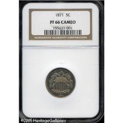 <B>1871 5C PR66 Cameo NGC.</B></I> Light-gold patina blankets mark-free surfaces on this sharply-struck, splendid proof cameo. Lot:5848