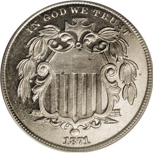 <B>1871<5C> PR66 Cameo PCGS.</B></I> This is a remarkable and highly desirable example with fully brilliant nickel-gray surfaces. The fields are deeply mirrored with excellent contrast. All of the design elements are fully detailed. This is a scarce date, and Gem business strikes are highly elusive, placing additional demand on high quality proof examples. Population: 9 in 66 Cameo, 0 finer (8/06).<BR><I>From The Troy Wiseman Collection.</B></I>