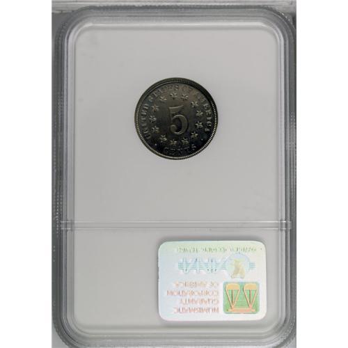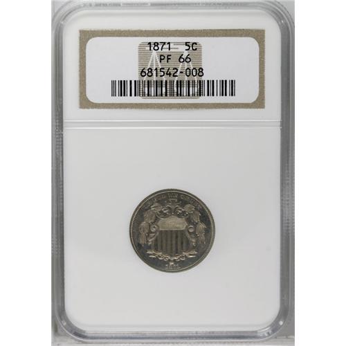<B>1871<5C> PR66 NGC.</B></I> A wonderful Gem proof with traces of pale gold toning over medium gray surfaces. Sharply struck with excellent proof surfaces and light contrast, although not certified as a Cameo example. Business strikes are rare, thus placing additional emphasis on the few surviving proofs.