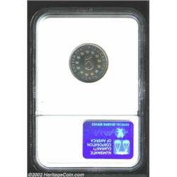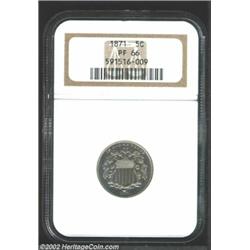 1871 5C PR66 NGC. Apricot patina dominates, but the obverse has a few flecks of russet color. The se