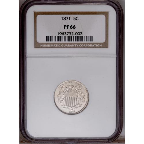 <B>1871<5C> PR66 NGC.</B></I> Brilliant and deeply mirrored on each side with a significant amount of mint frost on the devices, which gives the coin a desirable field-to-device contrast even though it is unrecognized as such on the insert. Brilliant throughout and just a dazzling type piece. A coin that must be seen to be truly appreciated. Census: 21 in 66, 4 finer (1/06).
