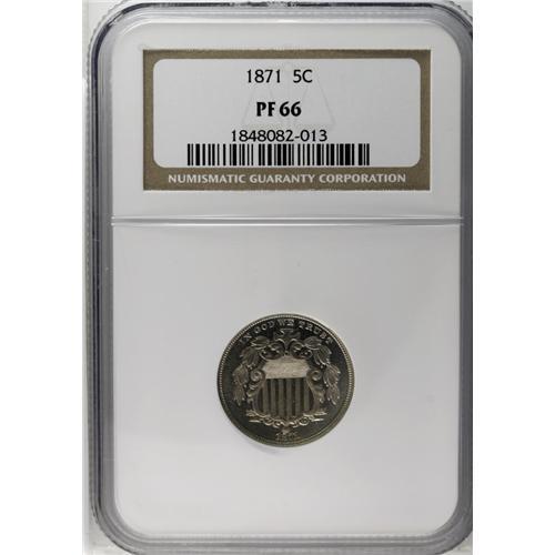 1871 5C PR66 NGC. This Premium Gem is well-preserved,