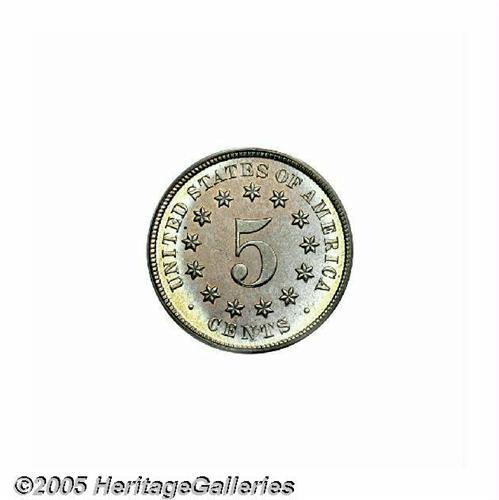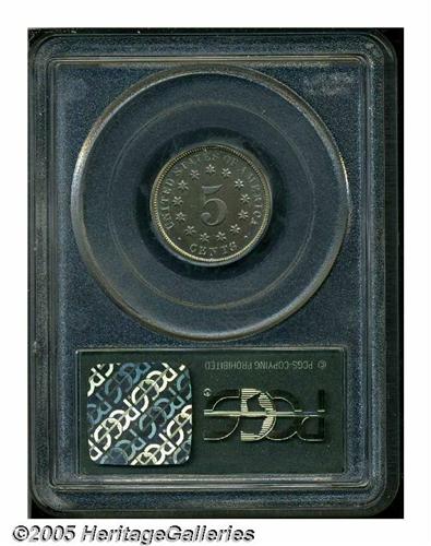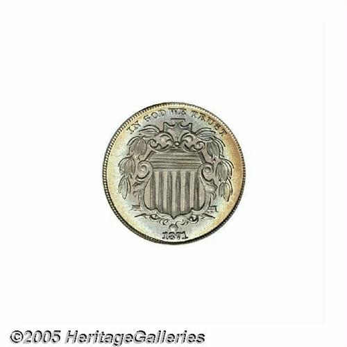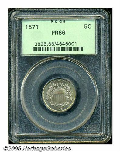 <B>1871<5C> PR66 PCGS.</B></I> Peach, sky-blue, and gold colors adorn this well struck and nearly immaculate premium Gem. An interesting lintmark (as made) is left of the prominent 5. A better date within the series, scarcer as both a business strike and a proof when compared with such common dates as 1882. Certified in a green label holder. Population: 20 in 66, 0 finer (6/05).