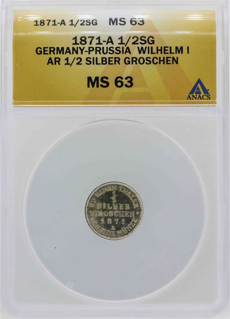 One 1871-A Germany-Prussia 1/2 Silber Groschen Coin ANACS MS63. ANACS Appraised.