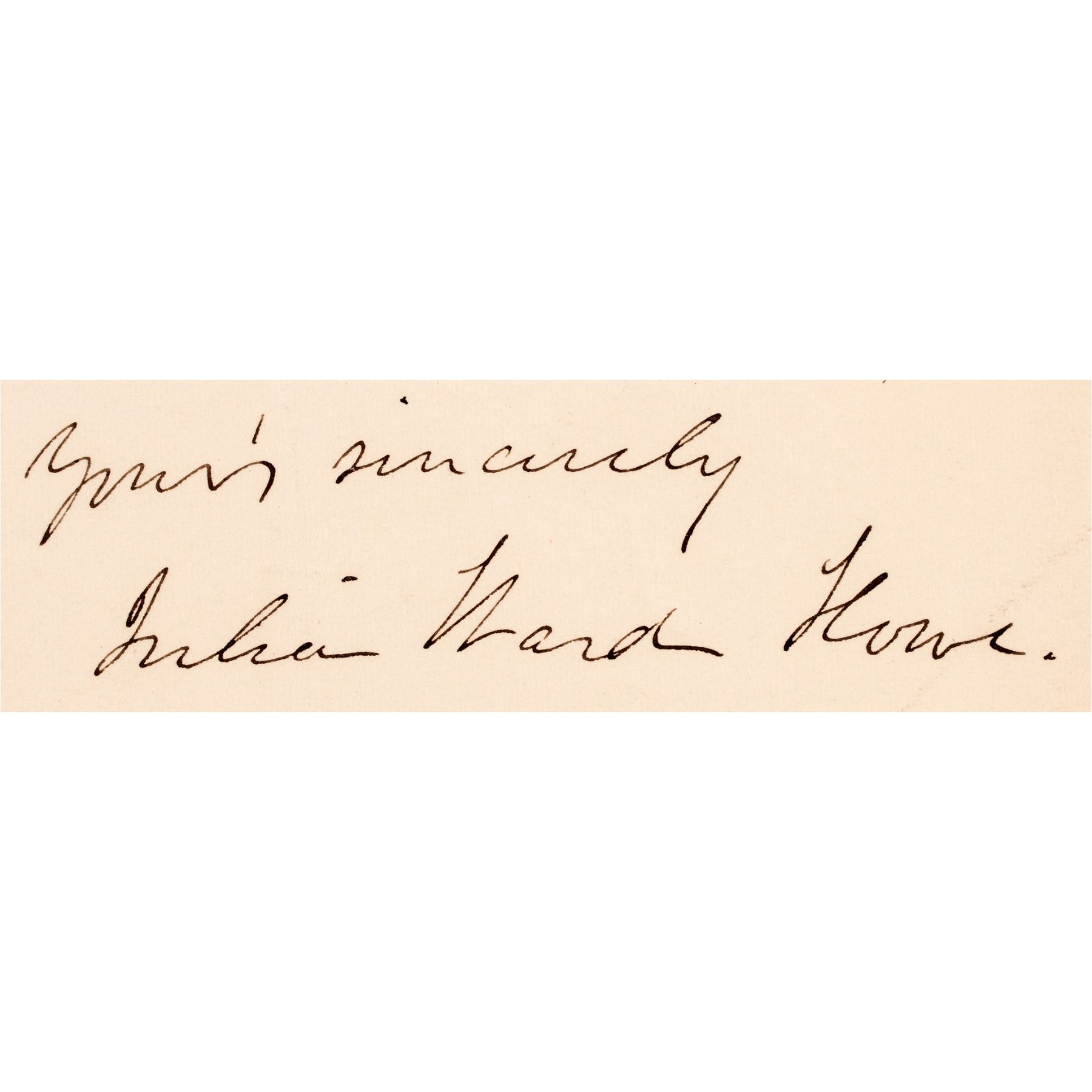 October 17, 1871-Dated, Autograph Letter Signed, “Julia Ward Howe”, 2 pages, measuring 4.5” x 7”, Boston, Very Fine.  Howe also became a Peace advocate, presiding over the Women’s International Peace Association this same year in 1871.  Julia Ward Howe writes to the then famous French Protestant theologian Reverend Athanase Coquerel, where she gracioualy accepts his acknowledgemnt invitation to to speak at the New England Woman's Club.  This Letter is nicely hand-written on wove period paper, lightly folded from mailing, fully dated together with her home address at top.  Howe writes, in part: