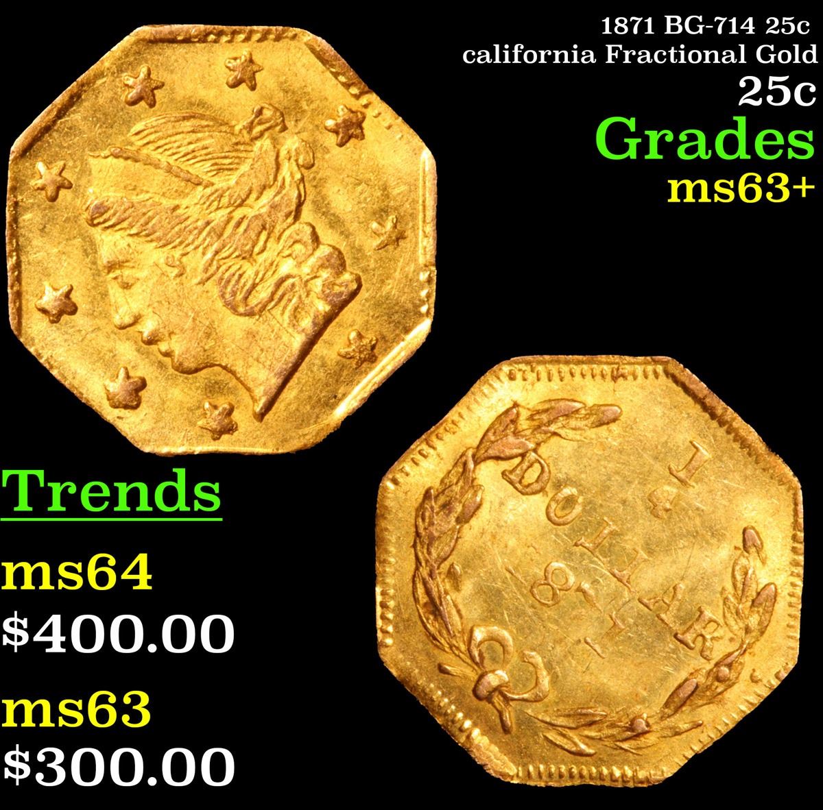 1871 BG-714 25c california Fractional Gold Grades Select+ Unc. Per PCGS: Only 300 Survive in all grades
