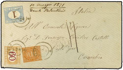 1871 BUENOS AYRES a ITALIA. Circulada por el correo britanico, fechador de doble circulo al dorso BUENOS-AYRES en azul. Tasada a la llegada con sellos italianos de 10 cts., 60 cts. y 1 lira. MAGNIFICA.