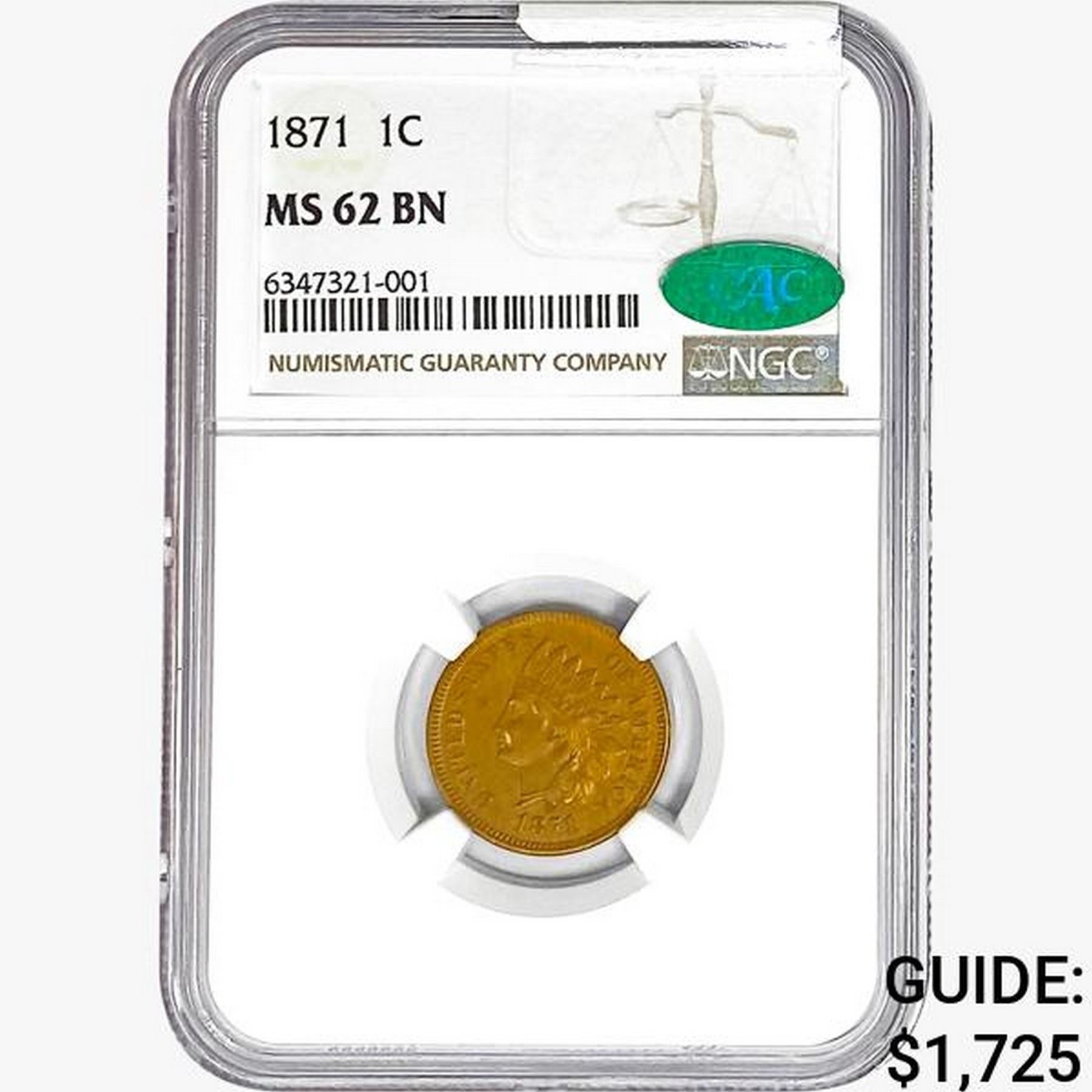 1871 CAC Indian Head Cent NGC MS62 BN