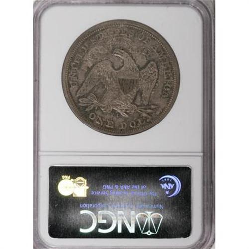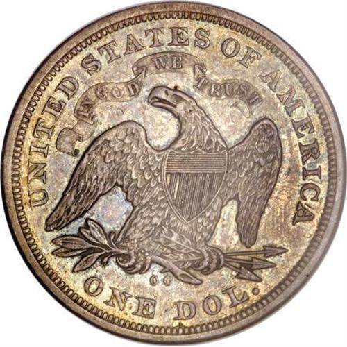 <B>1871-CC $1 AU58 NGC.</B></I> The 1871-CC has the lowest mintage of any silver dollar issue from the Carson City Mint, and is second in rarity only to the 1873-CC. Q. David Bowers, in his 1993 silver dollar <I>Encyclopedia</B></I>, estimated between 85 and 125 survivors in circulated grades. A mere seven coins have been certified at AU58 through the combined efforts of NGC and PCGS, and just seven more are known in Mint State, as of (03/08).<BR> According to Weimar W. White (1985): "One of the rarest Liberty Seated dollar(sic) in all grades. This coin always excites the silver dollar specialist when offered for sale. ... This great date, when available, is almost always offered for sale in circulated condition." (from <I>The Liberty Seated Dollar 1840-1873</B></I>, page 54.)<BR> This piece is solidly struck, with bold details noted on Liberty's head and foot, and on all of the eagle's feathers and talons. With the aid of magnification, minor doubling is evident on many of the lower reverse design elements, but this appears to be shelf-like 'machine' or 'strike' doubling. The tan coloration over each side seems entirely original, and iridescent green and gold accents are prominent on the reverse. A great deal of satin-like luster and considerable semi-prooflikeness remains evident on the lightly marked surfaces, which do not exhibit any singularly noteworthy or distracting abrasions. Only slight highpoint wear is observed on Liberty's head and hair, and on the eagle's neck feathers and wing tips. <BR><I>From The Queller Family Collection of Silver Dollars.</B></I><BR><BR><B>Coin Engraver:</B> Christian Gobrecht<BR><BR><b>Shipping:</b> Coins & Currency (<a target="_blank" href="http://www.heritageauctions.com/common/shipping.php">view shipping information</a>)