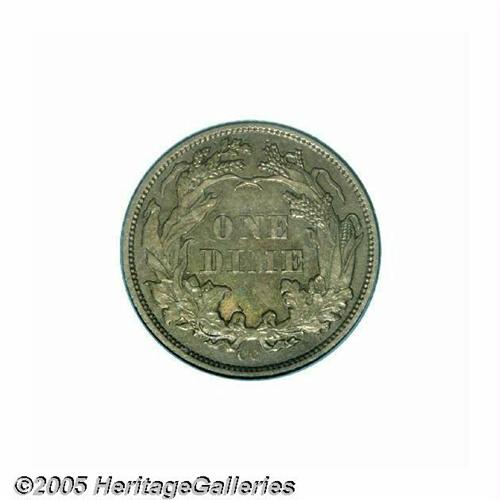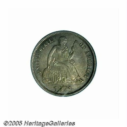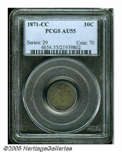 <B>1871-CC<10C> AU55 PCGS.</B></I> Only once before have we offered a choice AU example of this elusive issue. Furthermore, we have only offered six examples of this issue in all AU grades. This is an extremely rare date and it represents the very first Carson City Mint issue of the denomination. Only two finer coins have been certified by PCGS, possibly representing only one coin. This example is deeply toned with olive, gold, and green coloration on both sides. It is sharply struck with the sole exception of the ribbon knot on the reverse, which is opposite liberty's head on the obverse. Careful examination of the surfaces fails to reveal any imperfections other than the tiny abrasions normally associated with light circulation.