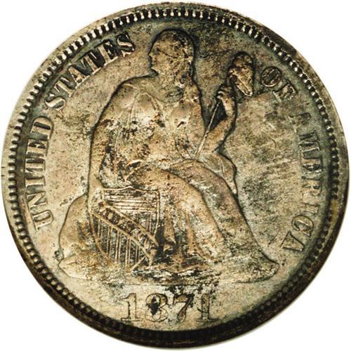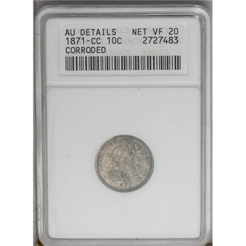1871-CC 10C --Corroded--ANACS. AU Details, Net VF20. Th 1871-CC[10C]--Corroded--ANACS. AU Details, N