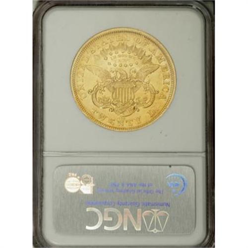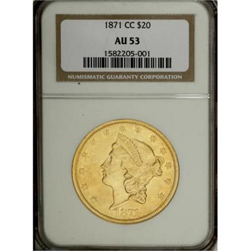 <B>1871-CC $20 AU53 NGC.</B></I> Numismatists would be fascinated to know that the combined mintage of all double eagles struck at the Carson City Mint is only 864,128 coins. That is less than one million coins out of a production of 19 different issues between the years of 1870 and 1893. When considering the wholesale meltings during the 1930s, widespread circulation of most CC issues and other causes of attrition, it's no wonder that certain dates are so difficult for collectors to locate. Of the 19 issues, the 1871-CC is considered the second rarest by Carson City gold experts, with approximately 200 coins extant in all grades. The <I>Guide Book of Double Eagle Gold Coins</B></I> by Dave Bowers suggests that 21 pieces exist at the AU53 level. The NGC <I>Census Report </B></I>and the PCGS <I>Population Report </B></I>put the number slightly higher, but one must consider how the reports can become skewed through the phenomenon of resubmissions. Perhaps Doug Winter, in his <I>Gold Coins of the Carson City Mint</B></I> (2001), sums it up best when he wrote: "The 1871-CC is the second rarest Carson City double eagle. When available, the typical piece grades Very Fine to Extremely Fine. This is a very scarce date in About Uncirculated and most of the pieces known in this grade range are no better than About Uncirculated-50. The 1871-CC becomes rare in About Uncirculated-55 and it is very rare in About Uncirculated-58. This is an extremely rare coin in Uncirculated with just two or three pieces currently known." Bowers (2006) estimates the number of Uncirculated '71-CC dollars in existence to be no more than six. This fact leaves most collectors more than content with the acquisition of a respectable AU53 example.<BR> Attractive green-gold coloration and a solid strike, for the issue, are the highlights of this coin. The mildly abraded surfaces display a semiprooflikeness and are what one would expect to see on an 1871-CC twenty. For most collectors, this is as good as it gets.<BR><BR><B>Coin Engraver:</B> James B. Longacre<BR><BR><b>Shipping:</b> Coins & Currency (<a target="_blank" href="http://www.heritageauctions.com/common/shipping.php">view shipping information</a>)