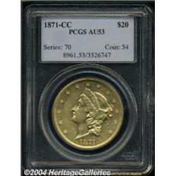 <table><tbody><tr><td><table> <TR><TD width="100%"><TABLE cellSpacing=1 cellPadding=3 width="100%" border=0><TBODY><TR><TD width="100%" bgColor=#79735c><FONT face=arial color=#ffffff size=3><B>Description</B> </FONT></TD></TR><TR><TD width="100%" bgColor=#ffffff><FONT face=arial size=2><B>1871-CC $20 AU53 PCGS.</B></I> Variety 1-A, the only known dies. The 1871-CC is a well known rarity in the Carson City series, second only to the 1870-CC. Only 17,387 pieces were struck, but this only partially explains this issue's rarity, as heavy circulation out west took a heavy toll on the number of survivors. An estimated 200-250 pieces exist today with perhaps four dozen in the various grades of About Uncirculated. This is a sharply defined example that has bright yellow-gold coloration. The surfaces are peppered with numerous small abrasions but none really merit individual mention. Only slight wear is evident on each side.<BR><I>From a Magnificent Collection of Double Eagles.</B></I> </FONT></TD></TR></TBODY></TABLE></TD></TR></TBODY></TABLE><BR><A name=PricesRealized></A><TABLE cellSpacing=0 cellPadding=0 width="100%" bgColor=#000000 border=0><TBODY><TR><TD width="100%"><TABLE cellSpacing=1 cellPadding=3 width="100%" border=0><TBODY><TR><TD width="100%" bgColor=#79735c><A name=PR><FONT face=arial color=#ffffff size=3><B>Previous Prices from Heritage Auctions</B> </FONT></A></TD></TR><TR><TD bgColor=#f6f6ed><TABLE cellSpacing=0 cellPadding=0 width="100%" border=1><TBODY><TR><TD align=middle width="33%"><B>Date</B></TD><TD align=middle width="33%"><B>Service</B></TD><TD align=middle width="33%"><B>Price</B></TD></TR><TR bgColor=whitesmoke><TD width="33%"><B>08/01/1998</B></TD><TD width="33%">PCGS</TD><TD width="33%">$13,800.00</TD></TR></TBODY></TABLE></TD></TR><TR><TD bgColor=#ffffff><FONT face=arial size=1 ?>PLEASE NOTE: All prices realized reflect the final hammer price PLUS the buyer's premium in auctions that charge a buyer's premium. Each item has a notation at the top of the listing indicating whether that lot included a buyer's premium. Example: A item that sells with a final hammer price of $100 and a 20% buyer's premium will display with a price realized of $120. All information listed is intended to be as accurate as possible, but errors are possible. Please use this guide carefully and inform us of any inaccuracies. </FONT></TD></TR></TBODY></TABLE></TD></TR></TBODY></TABLE><BR><TABLE cellSpacing=0 cellPadding=0 width="100%" bgColor=#000000 border=0><TBODY><TR><TD width="100%"><TABLE cellSpacing=1 cellPadding=3 width="100%" border=0><TBODY><TR><TD width="100%" bgColor=#79735c colSpan=6><FONT face=arial color=#ffffff size=3><B>Price Guide*</B> </FONT></TD></TR><TR bgColor=#f6f6ed><TD align=middle><B>Grade</B> </TD><TD align=middle><B>Coin World<BR>(Trends)</B> </TD><TD align=middle><B>Numismedia<BR>Retail</B> </TD><TD align=middle><B>Numismedia<BR>Wholesale</B> </TD><TD align=middle><B>Coin<BR>Universe</B> </TD><TD align=middle><B>Heritage<BR>Value Index</B> </TD></TR><TR bgColor=#ffffff><TD align=middle>50</TD><TD align=right>$15,000.00</TD><TD align=right>---</TD><TD align=right>$13,500.00</TD><TD align=right>---</TD><TD align=right>$9,750.00</TD></TR><TR style="FONT-WEIGHT: bold" bgColor=#cccfdd><TD align=middle>53</TD><TD align=right>---</TD><TD align=right>---</TD><TD align=right>$15,500.00</TD><TD align=right>---</TD><TD align=right>$13,096.88</TD></TR><TR bgColor=#ffffff><TD align=middle>55</TD><TD align=right>$22,500.00</TD><TD align=right>---</TD><TD align=right>$19,550.00</TD><TD align=right>---</TD><TD align=right>$15,328.13</TD></TR><TR bgColor=#ffffff><TD colSpan=6><FONT size=1>*All information listed is intended to be as accurate as possible, but errors are possible. No item may be returned or refused based on this information which is provided as a service to our customers. You should contact each pricing source directly to determine the accuracy of this information. </FONT></TD></TR></TBODY></TABLE></TD></TR></TBODY></TABLE><BR><TABLE cellSpacing=0 cellPadding=0 width="100%" bgColor=#000000 border=0><TBODY><TR><TD width="100%"><TABLE cellSpacing=1 cellPadding=3 width="100%" border=0><TBODY><TR><TD width="100%" bgColor=#79735c><FONT face=arial color=#ffffff size=3><B>Population Guide</B> </FONT></TD></TR><TR bgColor=#ffffff><TD align=middle><!-- Begin Output of Population Grid--><TABLE cellSpacing=0 cellPadding=0 width="100%" border=0><TBODY><TR><TD vAlign=center><TABLE cellSpacing=0 width="100%" border=1 cellsadding="3"><TBODY><TR><TD vAlign=center><TABLE cellSpacing=0 cellPadding=3 width="100%" border=1><TBODY><TR><TD vAlign=center align=middle bgColor=#f0f1e8 colSpan=2 <CENTER><FONT face=Arial size=2><B>PCGS Pop </B></FONT><CENTER></CENTER></TD><TD vAlign=center align=middle bgColor=#f0f1e8 colSpan=2><CENTER><FONT face=Arial size=2><B>NGC Pop</B></CENTER></FONT></TD></TR><TR><TD vAlign=center><FONT face=Arial size=2>(53)</FONT> </TD><TD vAlign=center align=right><FONT face=Arial size=2>9</FONT> </TD><TD vAlign=center><FONT face=Arial size=2>(53)</FONT> </TD><TD vAlign=center align=right><FONT face=Arial size=2>29</FONT> </TD></TR><TR><TD vAlign=center><FONT face=Arial size=2>(>53)</FONT> </TD><TD vAlign=center align=right><FONT face=Arial size=2>9</FONT> </TD><TD vAlign=center><FONT face=Arial size=2>(>53)</FONT> </TD><TD vAlign=center align=right><FONT face=Arial size=2>110</FONT> </TD></TR></TBODY></TABLE></TD></TR></TBODY></TABLE></TD></TR></TBODY></TABLE><!-- End Output of Population Grid--></TD></TR></TBODY></TABLE></TD></TR></TBODY></TABLE><BR><TABLE cellSpacing=0 cellPadding=0 width="100%" bgColor=#000000 border=0><TBODY><TR> <font color='#000000'><span style='background-color: #FFFFFF'><td bgcolor='#FFFFFE'> Important notice: Heritage usually auctions material at the rate of 200-250 lots per hour. On some occasions eBay Live bid software or the Internet may not be able to keep up with the pace of the auction. We recommend placing a realistic absentee bid now 