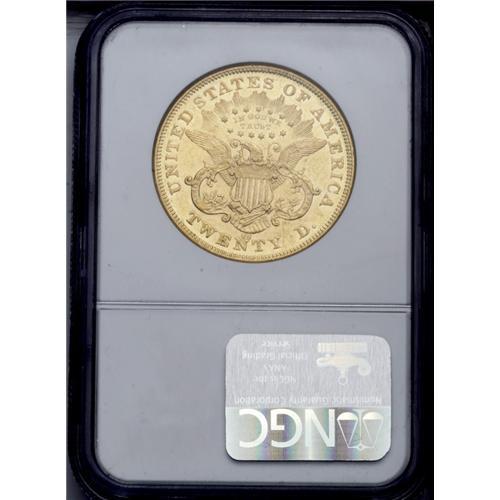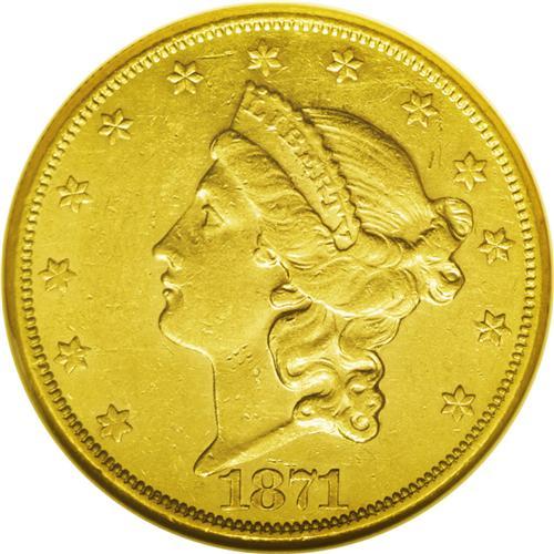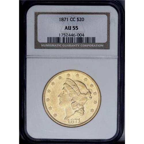 <B>1871-CC<$20> AU55 NGC.</B></I> This is the second year of production at the Carson City Mint, and this date is the second rarest, behind the 1870-CC, a date that is in its own league. Most of the 17,387 double eagles coined were immediately sent into circulation, and few were saved as there were few collectors in that West with any desire to preserve examples. A couple Mint State examples have survived only as a matter of chance. In fact, Doug Winter has recorded two Mint State coins (63, 61) and nine coins grading either AU55 or AU58. Accordingly, this example is undoubtedly in the top dozen examples known of the date. This example has deep green-gold color with evidence of reflective fields. Both sides have wispy rose overtones with a few minor abrasions but no marks worth noting individually. Carson City specialist and author Rusty Goe may have been examining this coin we he commented: "Of the surviving 1871-CCs extent, few are inspiring, although there are several AU55 and AU58 examples which possess higher than average eye appeal."<BR><I>From The Wyoming Collection.</B></I>