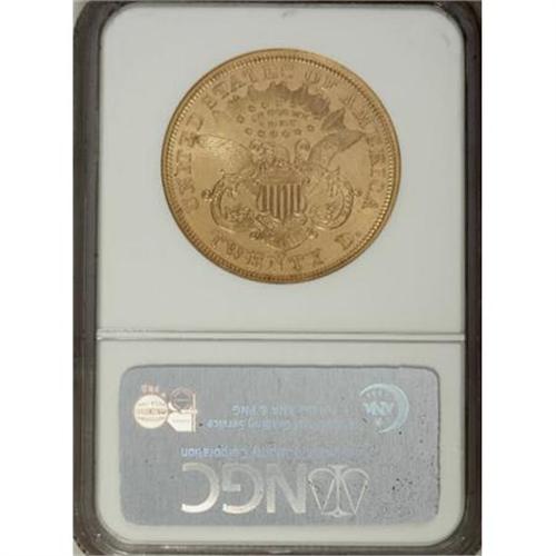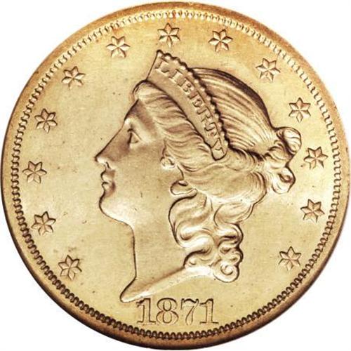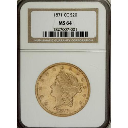 <B>1871-CC $20 MS64 NGC.</B></I> In 1988, David Akers described this coin as a "unique Choice Mint State" example, the finest known specimen, and "truly a one-of-a-kind item." Nothing has changed, and today this piece remains the only Choice Mint State piece, an amazing NGC certified MS64 example. The finest that PCGS has ever certified is just AU55, and only five coins have been NGC certified as MS60 or finer, including this coin, two MS61 pieces, and two MS60 examples.<BR> The Carson City Mint began operations in 1870, in response to demand for a second Western Mint to handle the incredible amounts of gold discovered in the region. During the first year, the new Mint produced quarters, half dollars, dollars, half eagles, eagles, and double eagles. Production totaled 92,087 coins with a total face value of $214,386.50. The next year saw the addition of dimes, and a nearly triple the previous year's production, with 232,558 coins minted, amounting to $615,523.50 face value.<BR> <BR><B>The Goe Commentary</B></I><BR> Rusty Goe, author of <I>The Mint on Carson Street,</B></I><B> </B></I>one of our favorite numismatic references, comments about the 1871-CC twenties:<BR> "Gold deposits had increased more than 800% at the Carson Mint between 1870 and 1871, though less than half of the gold bullion was returned in coin form, as miners requested equal amounts in the form of bars. This kept mintages lower, although double eagle production rose by nearly 390%.<BR> "It is believed that the largest percentage of double eagles minted in Carson City during the first few years of operations remained in Nevada, at least for a while. Years later, quantities of GÇÿCC' $20 gold pieces made their way to foreign lands as export demand increased. The early GÇÿCC' issues that did indeed circulate locally acquired heavy bagmarks and surface damage, greatly marring their appearance.<BR> "Of the surviving 1871-CCs extant, few are inspiring, although there are several AU-55 and AU-58 examples which possess higher than average eye appeal, and two Uncirculated specimens in particular stand head and shoulders above the rest, especially one that is graded by NGC as an MS-63." <BR> The MS63 coin Goe mentions is the same coin we are now offering, currently certified MS64.<BR><BR><B>Condition Census</B></I><BR> Doug Winter included a Condition Census for each issue in <I>Gold Coins of the Carson City Mint. </B></I>In addition to this piece, he recorded a single MS61 coin, five pieces tied at AU58, and four others graded AU55.<BR><BR> This example is sharply struck with every design element boldly defined. It is sharper than most contemporary double eagles from any mint. The surfaces of this piece are amazing, entirely free of bagmarks, and entirely unlike the usual example. Both sides have remarkable satiny luster with full mint brilliance, the fields faintly reflective.<BR><BR><B>Coin Engraver:</B> James B. Longacre<BR><BR><b>Shipping:</b> Coins & Currency (<a target="_blank" href="http://www.heritageauctions.com/common/shipping.php">view shipping information</a>)