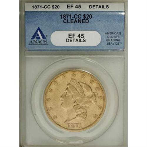 <B>1871-CC $20 --Cleaned--ANACS. XF45 Details.</B></I> Variety 1-A, the only variety known for the year. The 1871-CC double eagle, with a mintage of 17,387 pieces, is the second rarest Carson City twenty dollar. Moreover, the issue possesses less than stellar eye appeal. Rusty Goe, in his <I>The Mint on Carson Street</B></I>, says "Of the surviving 1871-CCs extant, few are inspiring ... ." In his <I>Gold Coins of the Carson City Mint</B></I>, Douglas Winter elaborates: "The surfaces on virtually every known 1871-CC are very heavily abraded. These marks are often deep and detracting. The obverse fields are usually the most heavily abraded area. There are few known with relatively clean surfaces ... ."<BR> The straw-gold surfaces of this XF45 Details example does reveal a number of small contact marks, particularly on the obverse, but they do not appear to be that "deep and detracting" for a large gold coin that saw some circulation. Fine obverse hairlines are also noted under magnification, as are a few light pinscratches left of the date. Save for minor softness in portions of Liberty's hair, the design elements are well defined.<BR> All in all, we would say this is a better-than-average circulated 1871-CC double eagle, despite the light cleaning. And the marks scattered about are well within the context of the grade designation. The collector interested in rare Carson City coinage should not let this opportunity pass by.<BR><BR><B>Coin Engraver:</B> James B. Longacre<BR><BR><b>Shipping:</b> Coins & Currency (<a target="_blank" href="http://www.heritageauctions.com/common/shipping.php">view shipping information</a>)