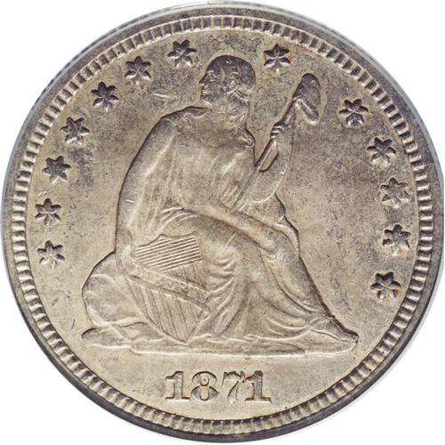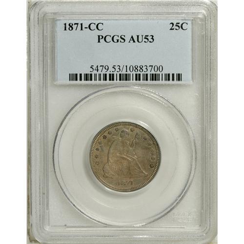 <B>1871-CC 25C AU53 PCGS.</B></I> All Carson City quarters are rare and all qualify for either key or semi-key status. The legendary rarity in this group is the 1873-CC No Arrows, an issue that had a mintage of only 4,000 but almost all were melted. All the Carson City issues also had low mintages--the series high was 12,464 pieces for the 1873-CC Arrows. Naturally, when any of these are offered for sale at public auction they are highlight coins. Only 10,890 examples were struck of the 1871-CC quarter, an increase of only $637.50 over the production level from 1870. In his book <I>The Mint on Carson Street,</B></I> Rusty Goe discusses the total value of 1871-CC quarters, that is, $2,722.50. He then proposes an intriguing theory regarding the odd amount of $22.50 that is tacked onto the mintage.<BR><BR> "The odd amount of $22.50 face value, or 90 individual quarters was included in the first delivery total for 1871, probably representing the amount divided between assay coins, and those distributed to key residents in the area. Readers will also remember that in 1870 a somewhat extraneous total of 40 quarters was minted at Carson City for similar purposes. Today's depleted populations of 1871-CC quarters imply that no more than 90 pieces ever escaped from storage vaults at the Carson Mint."<BR><BR> This theory only lacks documentary evidence to support it, as the numbers known today of this issue already indicate that this is most likely what happened. Only 41 pieces have been certified in all grades by both PCGS and NGC, minus an uncertain number of resubmissions. This would indicate that fewer than 50% of the pieces released survive today, a percentage that is consistent with proofs from the late 19th century.<BR> As one might easily imagine, the 1871-CC is also an important condition rarity. Three Mint State pieces are known, and then there is a drop down to the AU55 level, which is represented by a single coin. Only two other coins have been certified (by PCGS and NGC combined) at the AU53 level, placing this piece at the lower end of the Condition Census for the issue. This is a lovely, well-preserved example of this important Carson City issue. Even golden-brown patina overlies the surfaces on each side with a significant amount of luster remaining around the devices. A bit softly struck on the peripheral stars. There is an identifying mark in the upper obverse field, the only abrasion of note on this important coin.<BR><BR><b>Shipping:</b> Coin/Currency (<a target="_blank" href="http://www.heritageauctions.com/common/shipping.php">view shipping information</a>)