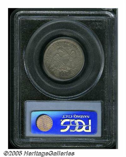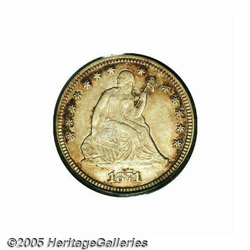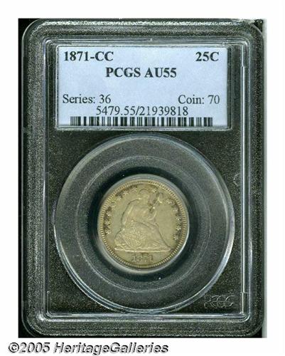 <B>1871-CC<25C> AU55 PCGS.</B></I> The 1871-CC is the second scarcest Carson City quarter, and it has an impressively low mintage of only 10,890 pieces. This is an issue that is both an absolute as well as a condition rarity, both attributes being fully realized in this particular coin. Larry Briggs called the '71-CC a High R.6 in XF/AU grades. Only 2-3 pieces are known in AU and an equal number are extant today in mint condition. Carson City silver from the early 1870s is invariably found with extensive signs of circulation. The 1871-CC quarter is no exception with the average piece in Good-Very Good condition. CC silver coins from this era are also frequently seen with rougher surfaces than their Philadelphia or San Francisco counterparts. This is because the Carson City mint used a shortcut to produce these pieces: they struck the coins from unalloyed Comstock silver. Comstock silver had a very high silver content and in its natural state was very close to coin silver. However, close was not close enough as the coins often show granular surfaces from the impurities that remained in the unalloyed silver. This particular coin seems to be curiously lacking that granularity, with only the slightest bit evident over the highpoints (with strong magnification), indicating that either: 1) this piece was actually struck from coin silver; or 2) the unalloyed state of this batch of silver was so close to the 90/10 ratio legally required that virtually no other elements were present to pollute the struck coin. As with most of the high grade examples known of this issue, the devices are sharply defined throughout. A number of tiny abrasions are scattered over each side, but these small marks are entirely consistent with a coin that was briefly handled in the channels of commerce. Light, even gray-golden toning covers each side with occasional deeper accents seen around the obverse periphery. An important coin for the Carson City specialist and an opportunity that is not likely to be repeated again in the near-future.