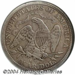 <B>1871-CC<25C> Cleaned, Retoned--ANACS. Fine Details, Net VG8.</B></I> The low mintage (10,890) 1871-CC is one of the rarest Seated Liberty quarters in all grades. Larry Briggs, in his <I>The Comprehensive Encyclopedia of U.S. Liberty Seated Quarters,</B></I> indicates that this issue is rarely seen above VG, with most pieces being good or worse. The present example is light to medium gray in the fields, and just a shade lighter on the design elements. Several faint parallel pinscratches diagonally traverse Liberty's legs. A few other scattered trivial marks in the obverse fields and on the eagle's left wing are also noted.<BR><I>From The Paulsboro Collection, Part Two.</B></I> <BR><BR><B>Important notice:</B> Heritage usually auctions material at the rate of 200-250 lots per hour. On some occasions eBay Live bid software or the Internet may not be able to keep up with the pace of the auction. We recommend placing a realistic absentee bid now as insurance to avoid disappointment. Occasionally the auctioneer may eliminate or reject an eBay Live bid, and the auctioneer may also reopen a lot after the close of the eBay live bidding (usually because we missed an audience bid), and may reject your bid even if it shows you as the winning bidder. By bidding via eBay Live, you agree that Heritage may award the lot to another bidder at its sole discretion under the circumstances described above or any other reasonable circumstances. Since eBay bids are not shown to us until we open the lot on the floor, we treat those bids just like floor bids. In most cases the floor responds before the eBay bid is presented to us, due to Internet lag time, so for consistency we have made it a policy that floor bids are always considered first over tie eBay live bids. Also please note that all Heritage lots purchased through eBay Live carry a 20% Buyer's Premium. Please make sure you read the Terms and Conditions before you bid. </span></font></tr></table></td></tr></table>