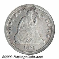 <TABLE cellSpacing=0 cellPadding=0 width="100%" bgColor=#000000 border=0><TBODY><TR><TD width="100%"><TABLE cellSpacing=1 cellPadding=3 width="100%" border=0><TBODY><TR><TD width="100%" bgColor=#79735c><FONT face=arial color=#ffffff size=3><B>Description</B> </FONT></TD></TR><TR><TD width="100%" bgColor=#ffffff><FONT face=arial size=2><B>1871-CC 25C --Corroded, Tooled, Cleaned--ANACS. XF Details, Net VF20.</B></I> Briggs 1-A. While the rustic and often crude production methods of the Carson City Mint have endeared it to modern numismatists, they have also had a deleterious effect on many of its surviving pieces. An unfortunate example is the elusive 1871-CC quarter that we highlight here. In a vain effort to shorten production time, the Carson City Mint often struck their early quarter issues from pure Comstock Lode silver. In direct contravention to the government's approved composition of 90% and 10% copper, these quarters were unable to withstand the rigors of the elements and widespread circulation. The current specimen unfortunately illustrates the wisdom of the government's mandate to include copper in the composition of all silver coins. Both the obverse and the reverse display rough, pitted surfaces that owe their existence to extensive porosity and corrosion. In addition, numerous scratches are seen over the obverse, and the coin has been cleaned in an attempt to "improve" its appearance. The faces still, however, display all major design elements and exhibit lavender-gray coloration throughout. Despite its obvious problems, this is an important representation of this scarce CC-mint issue that should be of obvious importance to specialists. </FONT></TD></TR></TBODY></TABLE></TD></TR></TBODY></TABLE><BR><A name=PricesRealized></A><TABLE cellSpacing=0 cellPadding=0 width="100%" bgColor=#000000 border=0><TBODY><TR><TD width="100%"><TABLE cellSpacing=1 cellPadding=3 width="100%" border=0><TBODY><TR><TD width="100%" bgColor=#79735c><A name=PR><FONT face=arial color=#ffffff size=3><B>Previous Prices from Heritage Auctions</B> </FONT></A></TD></TR><TR><TD bgColor=#f6f6ed>No Prior Data Recorded </TD></TR><TR><TD bgColor=#ffffff><FONT face=arial size=1 ?>PLEASE NOTE: All prices realized reflect the final hammer price PLUS the buyer's premium in auctions that charge a buyer's premium. Each item has a notation at the top of the listing indicating whether that lot included a buyer's premium. Example: A item that sells with a final hammer price of $100 and a 20% buyer's premium will display with a price realized of $120. All information listed is intended to be as accurate as possible, but errors are possible. Please use this guide carefully and inform us of any inaccuracies. </FONT></TD></TR></TBODY></TABLE></TD></TR></TBODY></TABLE><BR><TABLE cellSpacing=0 cellPadding=0 width="100%" bgColor=#000000 border=0><TBODY><TR><TD width="100%"><TABLE cellSpacing=1 cellPadding=3 width="100%" border=0><TBODY><TR><TD width="100%" bgColor=#79735c colSpan=6><FONT face=arial color=#ffffff size=3><B>Price Guide*</B> </FONT></TD></TR><TR bgColor=#f6f6ed><TD align=middle><B>Grade</B> </TD><TD align=middle><B>Coin World<BR>(Trends)</B> </TD><TD align=middle><B>Numismedia<BR>Retail</B> </TD><TD align=middle><B>Numismedia<BR>Wholesale</B> </TD><TD align=middle><B>Coin<BR>Universe</B> </TD><TD align=middle><B>Heritage<BR>Value Index</B> </TD></TR><TR bgColor=#ffffff><TD align=middle>15</TD><TD align=right>---</TD><TD align=right>---</TD><TD align=right>---</TD><TD align=right>---</TD><TD align=right>$4,034.61</TD></TR><TR style="FONT-WEIGHT: bold" bgColor=#cccfdd><TD align=middle>20</TD><TD align=right>$10,000.00</TD><TD align=right>---</TD><TD align=right>$8,050.00</TD><TD align=right>---</TD><TD align=right>$6,658.33</TD></TR><TR bgColor=#ffffff><TD align=middle>25</TD><TD align=right>---</TD><TD align=right>---</TD><TD align=right>---</TD><TD align=right>---</TD><TD align=right>$8,097.92</TD></TR><TR bgColor=#ffffff><TD colSpan=6><FONT size=1>*All information listed is intended to be as accurate as possible, but errors are possible. No item may be returned or refused based on this information which is provided as a service to our customers. You should contact each pricing source directly to determine the accuracy of this information. </FONT></TD></TR></TBODY></TABLE></TD></TR></TBODY></TABLE><BR><TABLE cellSpacing=0 cellPadding=0 width="100%" bgColor=#000000 border=0><TBODY><TR><TD width="100%"><TABLE cellSpacing=1 cellPadding=3 width="100%" border=0><TBODY><TR><TD width="100%" bgColor=#79735c><FONT face=arial color=#ffffff size=3><B>Population Guide</B> </FONT></TD></TR><TR bgColor=#ffffff><TD align=middle><!-- Begin Output of Population Grid--><TABLE cellSpacing=0 cellPadding=0 width="100%" border=0><TBODY><TR><TD vAlign=center><TABLE cellSpacing=0 width="100%" border=1 cellsadding="3"><TBODY><TR><TD vAlign=center><TABLE cellSpacing=0 cellPadding=3 width="100%" border=1><TBODY><TR><TD vAlign=center align=middle bgColor=#f0f1e8 colSpan=2 <CENTER><FONT face=Arial size=2><B>PCGS Pop </B></FONT><CENTER></CENTER></TD><TD vAlign=center align=middle bgColor=#f0f1e8 colSpan=2><CENTER><FONT face=Arial size=2><B>NGC Pop</B></CENTER></FONT></TD></TR><TR><TD vAlign=center><FONT face=Arial size=2>(20)</FONT> </TD><TD vAlign=center align=right><FONT face=Arial size=2>0</FONT> </TD><TD vAlign=center><FONT face=Arial size=2>(20)</FONT> </TD><TD vAlign=center align=right><FONT face=Arial size=2>0</FONT> </TD></TR><TR><TD vAlign=center><FONT face=Arial size=2>(>20)</FONT> </TD><TD vAlign=center align=right><FONT face=Arial size=2>5</FONT> </TD><TD vAlign=center><FONT face=Arial size=2>(>20)</FONT> </TD><TD vAlign=center align=right><FONT face=Arial size=2>5</FONT> </TD></TR></TBODY></TABLE></TD></TR></TBODY></TABLE></TD></TR></TBODY></TABLE><!-- End Output of Population Grid--> Important notice: Heritage usually auctions material at the rate of 200-250 lots per hour. On some occasions eBay Live bid software or the Internet 