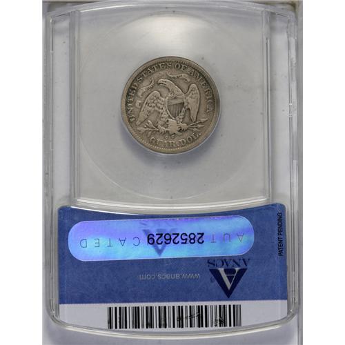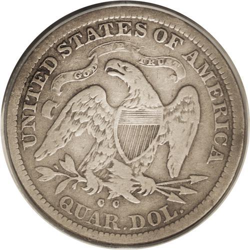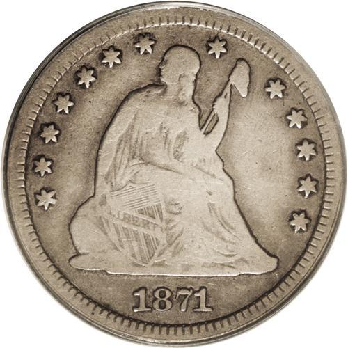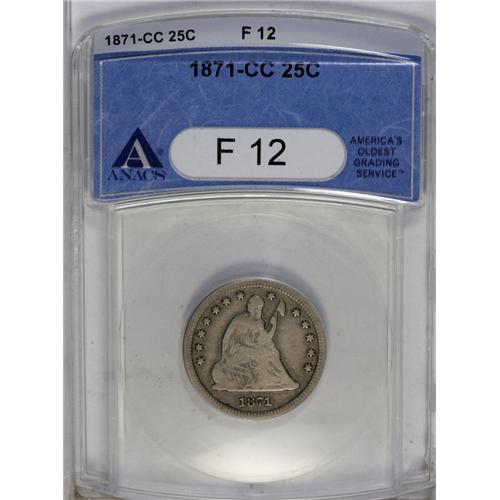 <B>1871-CC<25C> Fine 12 ANACS.</B></I> The 1871-CC is not as rare as the first-year 1870-CC, although only be a small margin. The present issue is seldom offered in any grade, and most survivors are corroded from having been struck on improperly prepared planchets, or damaged in some other way. This is a remarkably problem-free coin despite its long stint in circulation. There are no mentionable abrasions, and the surfaces are originally toned in medium golden-gray shades. A significant opportunity for the Seated quarter specialist.