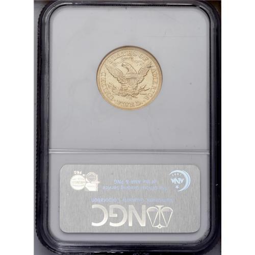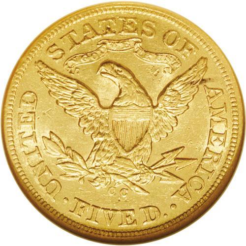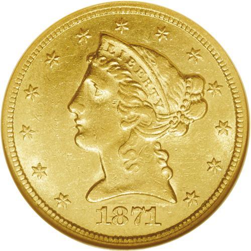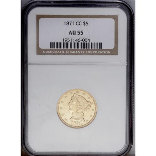 <B>1871-CC $5 AU55 NGC.</B></I> Variety 1-A. A very pretty coin that shows traces of luster in the protected areas and a healthy strike for this issue. No signs of weakness are spotted on the stars or curls, nor on the reverse thighs, claws or wings. The surfaces are attractive with minimal signs of contact from what had to have been a very brief foray into the channels of commerce for this coin. Identifiable by a minor nick below Liberty's temple, and a short scratch behind her lovelock near the back of her neck. On the reverse this coin is identifiable by a tiny nick on the lower left serif of the E in STATES, and a pair of nicks on either side of the last C in the mintmark. An outstanding specimen for the collector who demands eye appeal, a solid grade and clean surfaces. Census: 13 in 55, 6 finer (1/06).