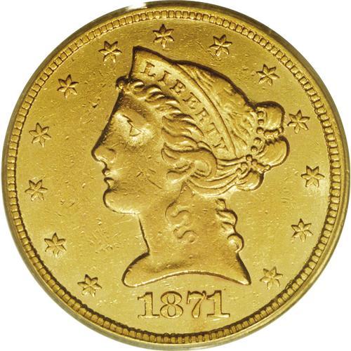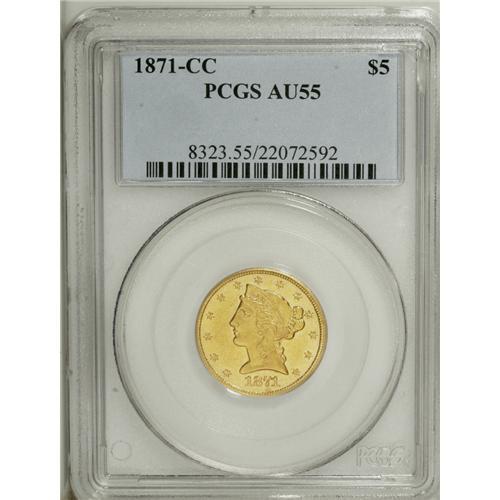 <B>1871-CC $5 AU55 PCGS.</B></I> Variety 1-A. A pretty coin that shows traces of luster in the protected areas and a healthy strike for this issue. No signs of weakness are spotted on the stars or curls, nor on the reverse thighs, claws or wings. The surfaces are attractive with minimal signs of contact from what had to have been a very brief foray into the channels of commerce for this coin. Identifiable by a minor nick below Liberty's temple, and a short scratch behind her lovelock near the back of her neck. On the reverse this coin is identifiable by a tiny nick on the lower left serif of the E in STATES, and a pair of nicks on either side of the last C in the mintmark. An outstanding specimen for the collector who demands eye appeal, a solid grade and clean surfaces. Population: 8 in 55, 5 finer (1/07).<BR><BR><b>Shipping:</b> Coins & Currency (<a target="_blank" href="http://www.heritageauctions.com/common/shipping.php">view shipping information</a>)